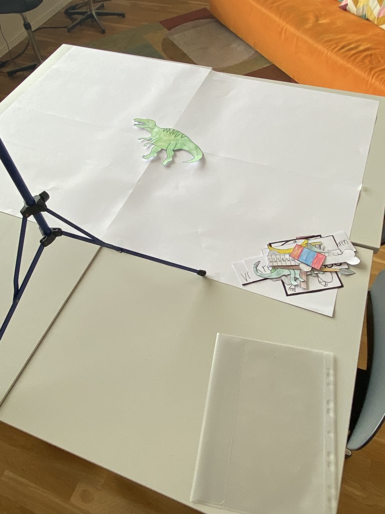 Die Schülerinnen und Schüler erstellen in kleinen Gruppen zu einem ausgewählten Dinosaurier einen Lernfilm. Dabei stellen sie Bilder und kurze Texte selber her und nutzen dies für einen Lernfilm mit der Legetechnik.