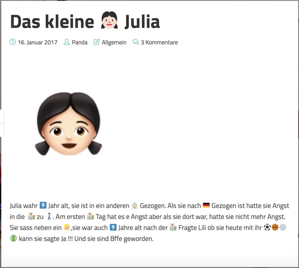 - Gemeinsam wird eine Emoji-Nachricht gelesen. Sie schreiben anschliessend in PA auch eine Emoji-Geschichte auf dem Tablet in Pages. Via Beamer wird diese der Klasse gezeigt und Rückmeldung gegeben, was noch optimiert werden kann.